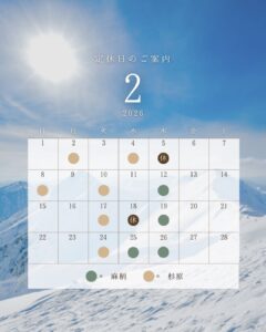 2月のスケジュールのお知らせ 麻柄 5(木)12(木)18(水)19(木)25(水)26(木) 杉原 2(月)4(水)5(木)8(日)10(火)17(火)18(水)24(火) 藤田*出勤日 4(水)8(日)12(木)17(火)19(木)25(水)26(木)